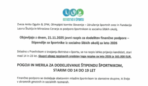 V okviru projekta Botrstvo v športu je objavljen javni razpis za pridobitev štipendij za leto 2026. Botrstvo v športu je unikaten skupni projekt Zveze Anita Ogulin & ZPM, Fundacije Leona Štuklja in Miroslava Cerarja ter Olimpijskega komiteja Slovenije – Združenja športnih zvez, ki je namenjen podpori mladim perspektivnim športnicam in športnikom iz socialno ogroženih okolij.