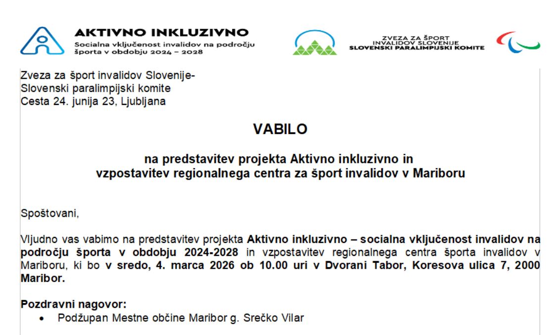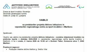 V sredo, 4. marca 2026, ob 10.00 bo v Dvorani Tabor (Koresova ulica 7, Maribor) potekala predstavitev projekta Aktivno inkluzivno – socialna vključenost invalidov na področju športa (2024–2028) ter predstavitev načrtovane vzpostavitve regionalnega centra za šport invalidov v Mariboru.